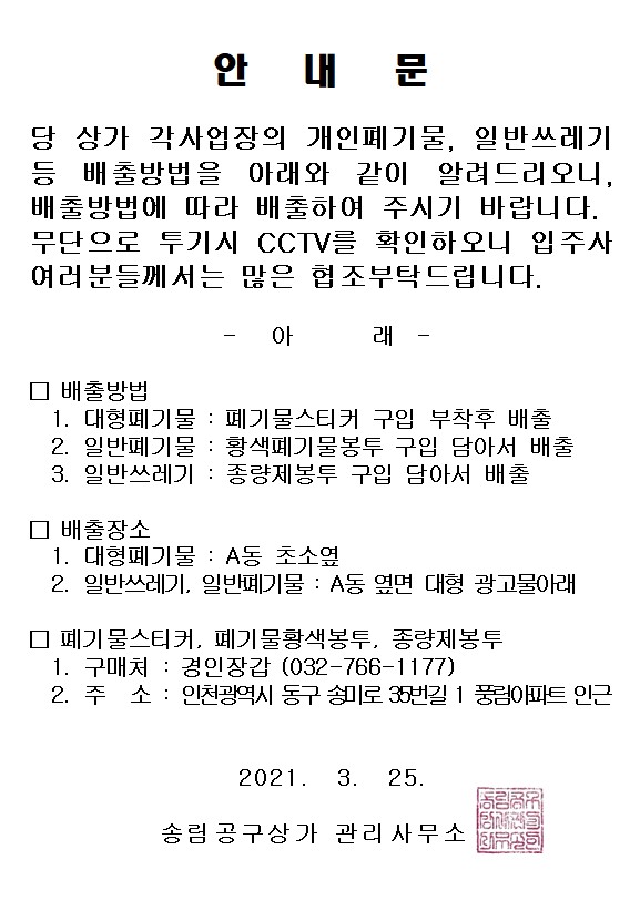 폐기물배출시 스티커 부착후 배출관련 안내문
