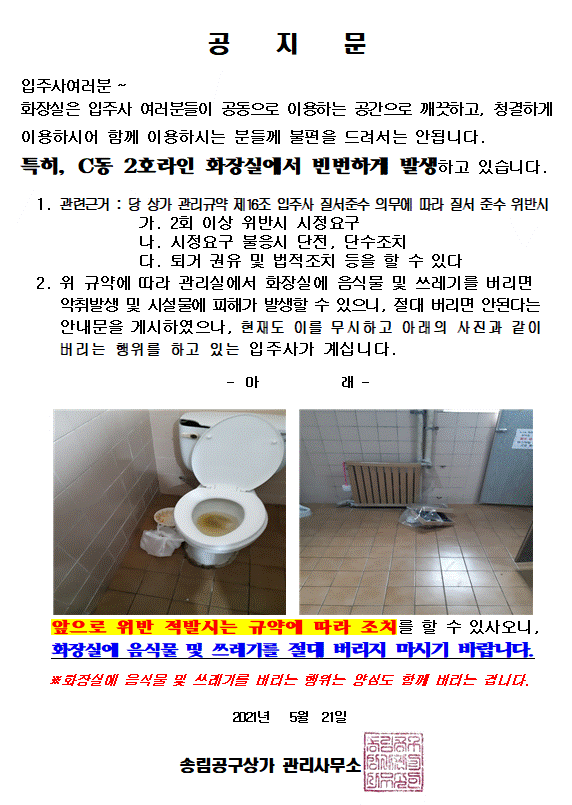 당 상가 화장실에 음식물 및 쓰레기 투척 금지 관련 공지문