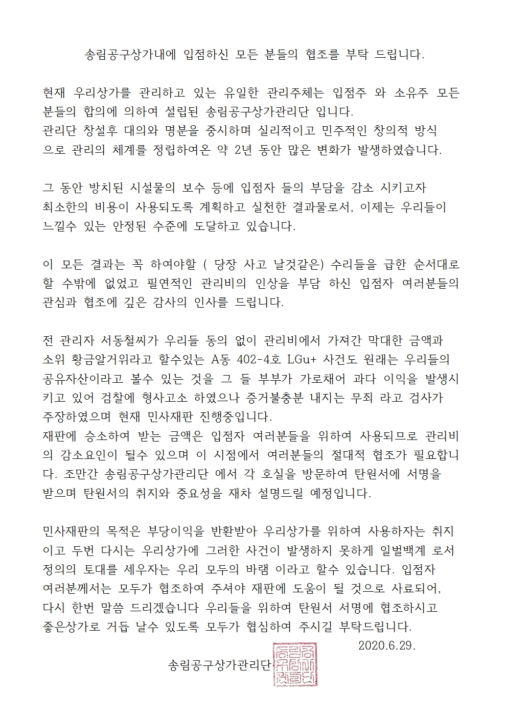 송림공구상가 입점주 탄원서 서명안내문