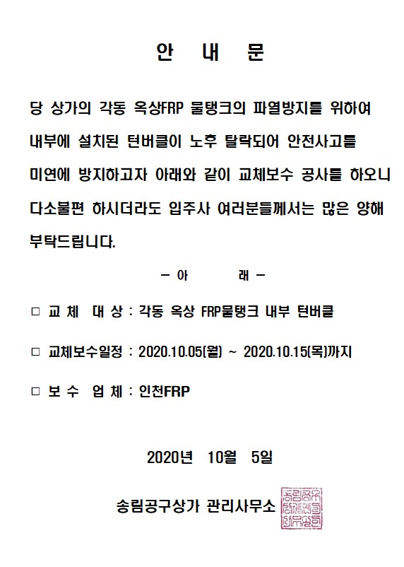 각동 옥상FRP 내부 턴버클 교체보수공사 안내문