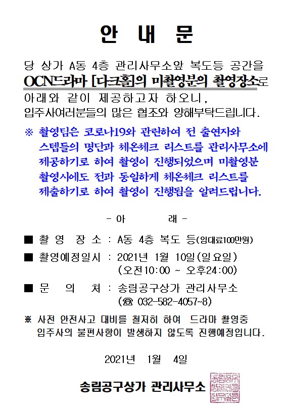 OCN드라마 [다크홀]의 추가 촬영 관련 안내문