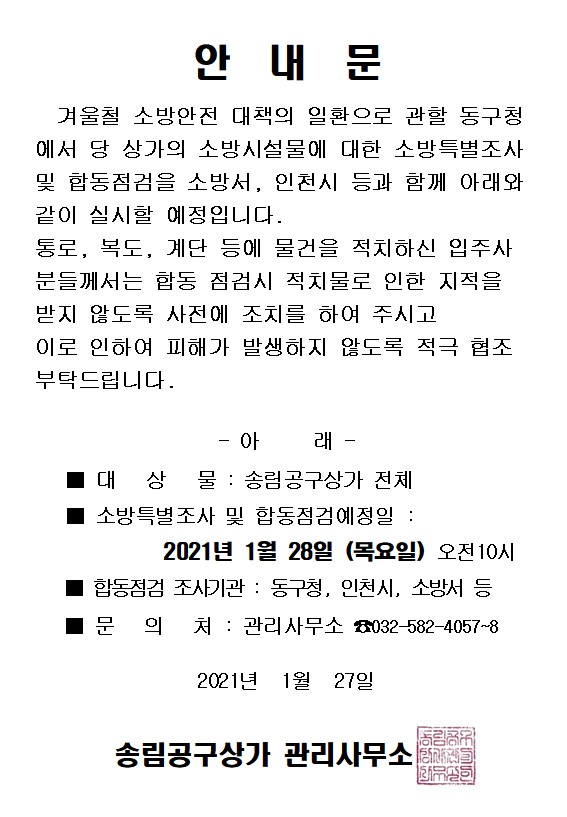 소방시설물 특별조사 및 합동점검 실시 관련 안내문
