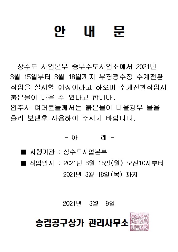 상수도사업본부 수계전환작업 관련 안내문